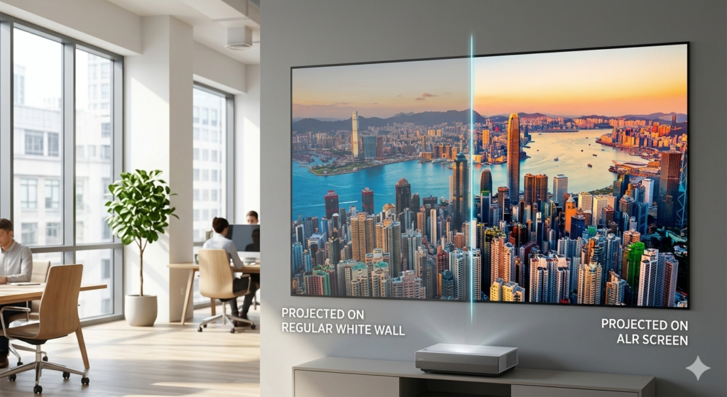 • The Science: It uses a microscopic “sawtooth” structure that absorbs 90% of overhead light while reflecting the projector’s light (from below) directly to your eyes.